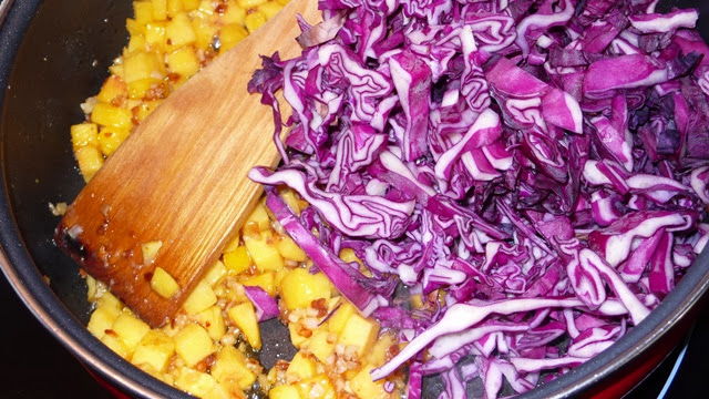 Cuando haya sofrito unos 5 minutos añadimos la lombarda picada, ojo en crudo que es como le queda el color más bonito