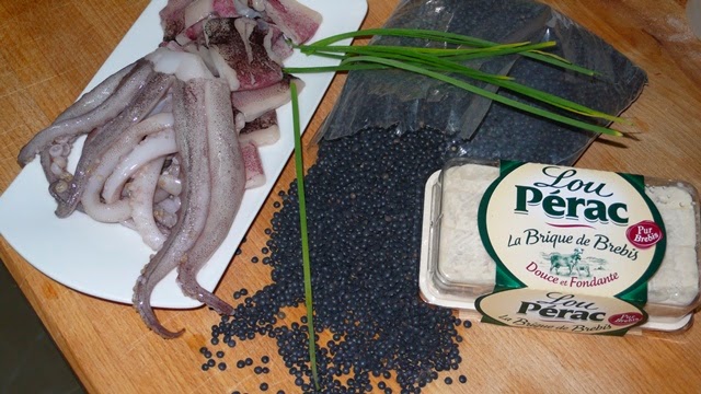 Necesitamos para unas 4 personas, 1/2 kg de lenteja negra de caviar, 600 grs de calamares y rabas de potón, 2 cucharadas de aceite de oliva, 800 ml de caldo de pescado, 200 grs de queso Lou Pérac, sal y un poco de cebollino picado.